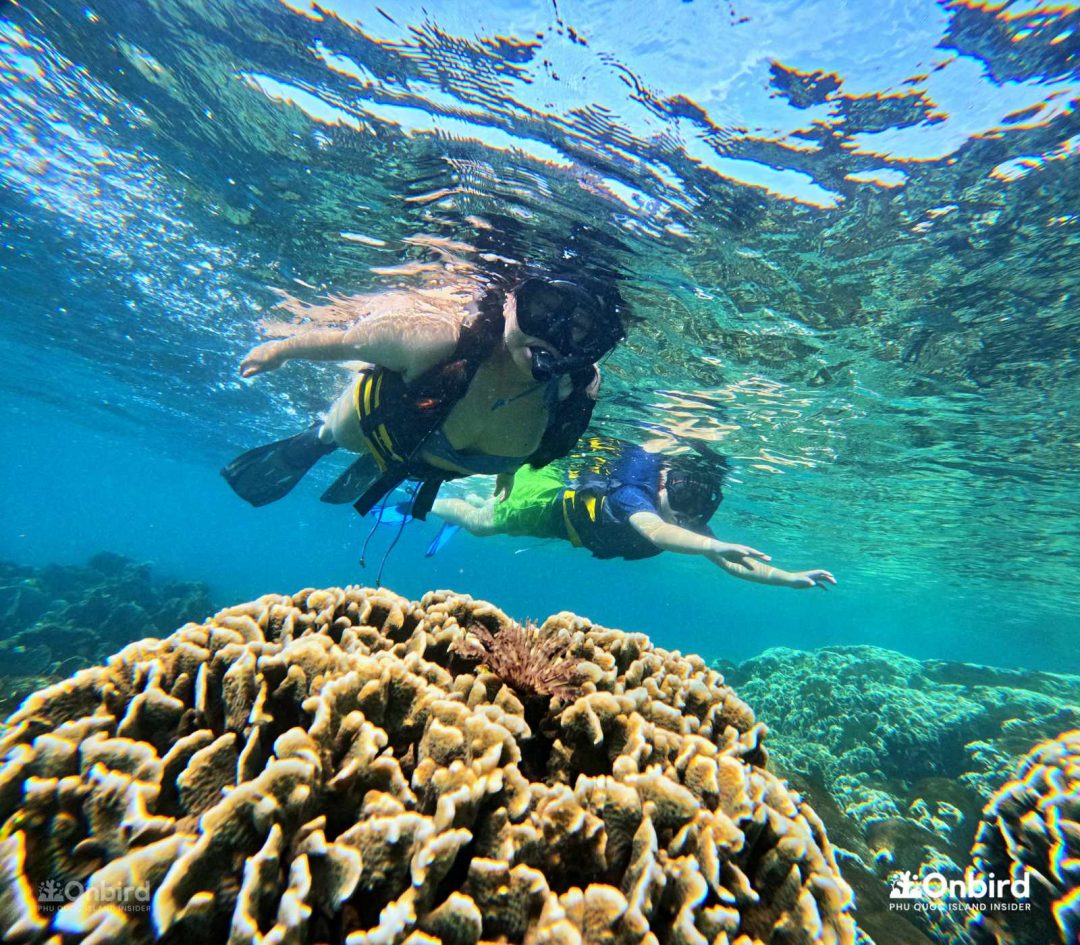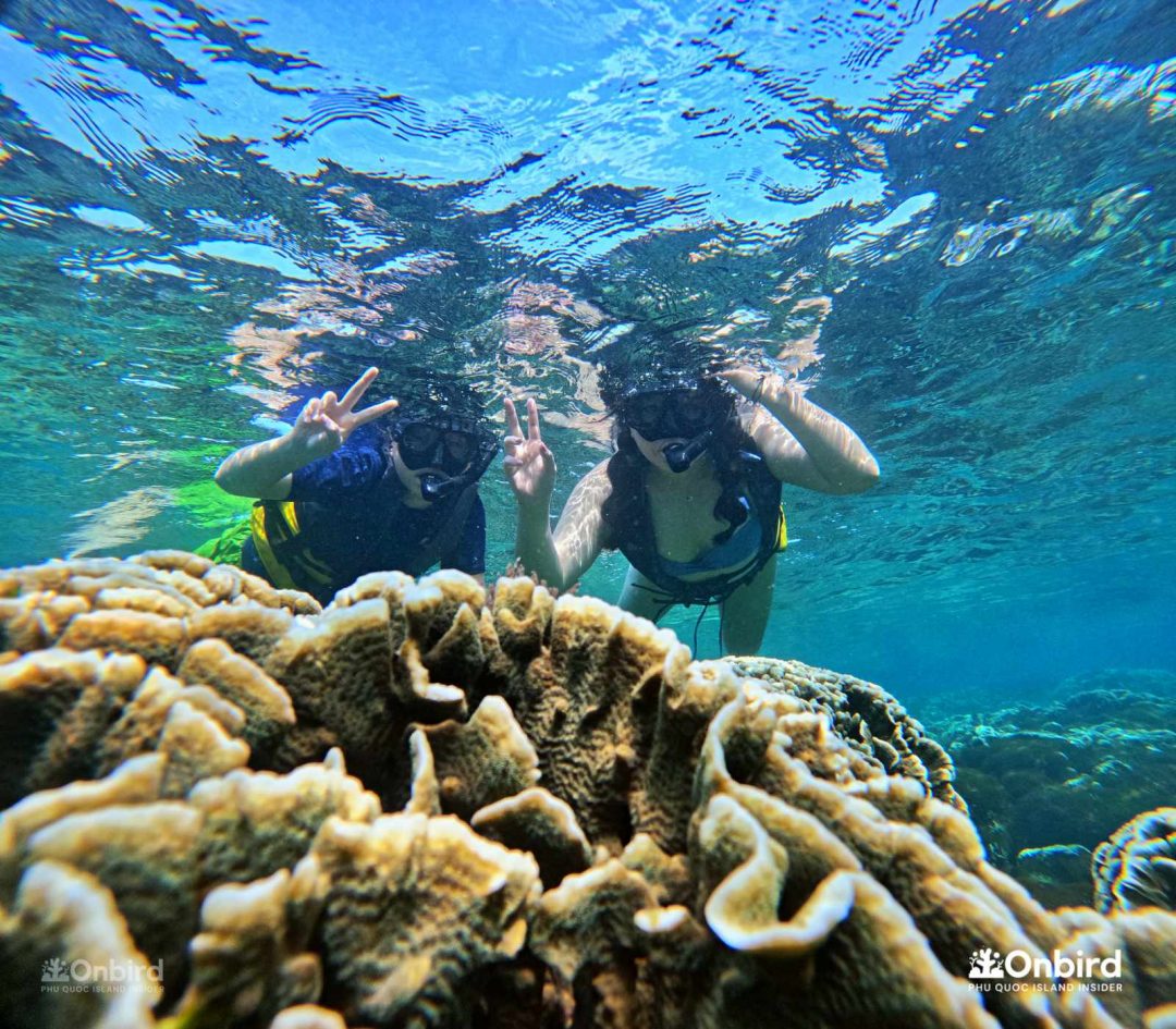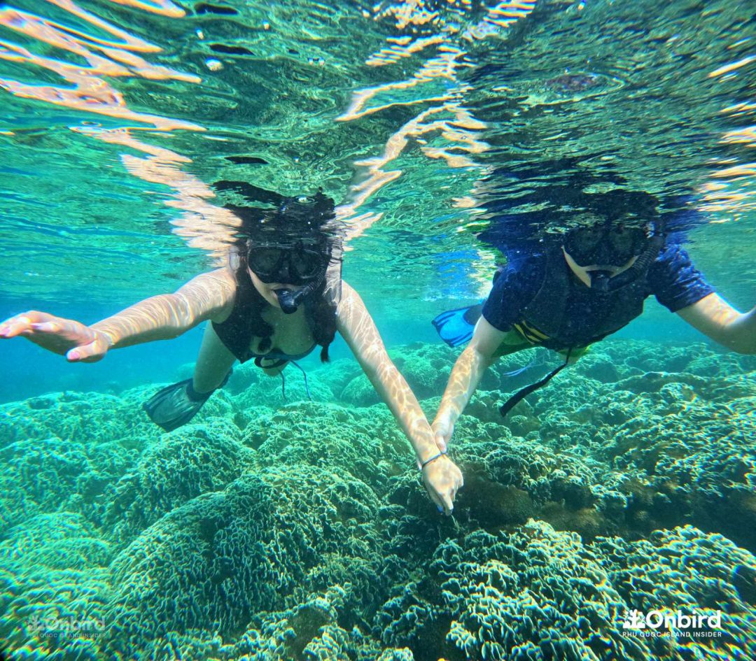 이런 별천지를 구명조끼를 입은 채로 둥둥 떠서 보는 것도 아름다웠지만, 구명조끼 없이 자유로움을 느끼면서 보는 것과는 비할 바가 안됩니다. 사람들이 왜 수중스포츠를 즐기는지 느낄 수 있었습니다라고 말하는 저는 수영을 아예 못합니다. 중간에 James가 와서 살려줄 테니ㅋㅋㅋㅋ 구명조끼를 벗어보라고 해서 에라 모르겠다 하고 벗어 던졌는데 오리발 때문에 생각보다 잘 뜨더라구요? 수영 못하시는 분들은 꼭 물에서 자유로이 움직이는 느낌을 느껴보라고 말씀드리고 싶네요. 두려움으로부터 벗어나게 도와준 덕분에 푸꾸옥을 더 만끽할 수 있었습니다.