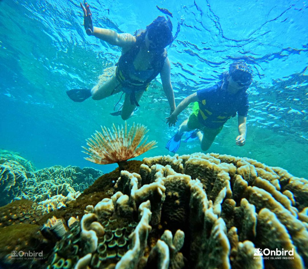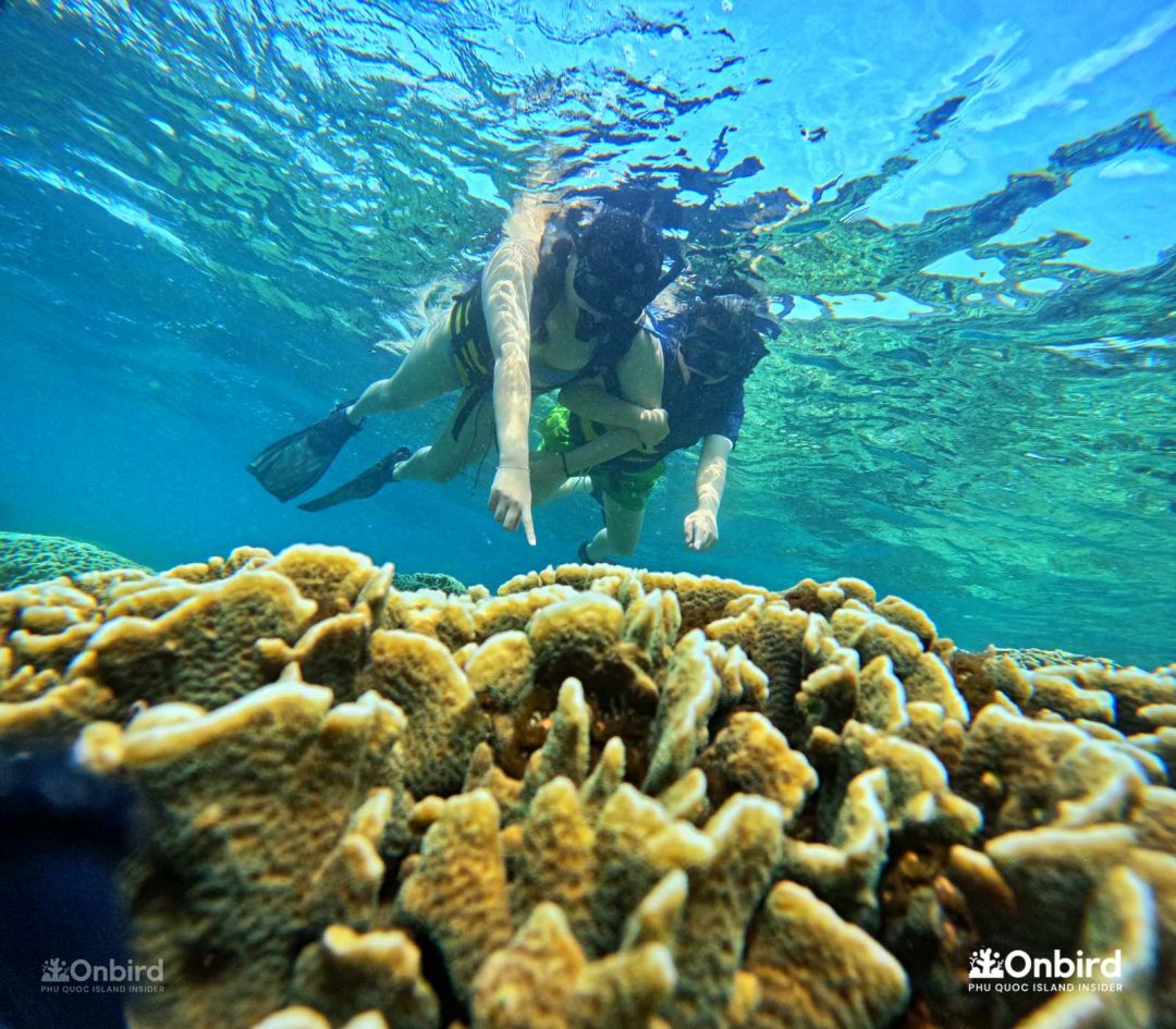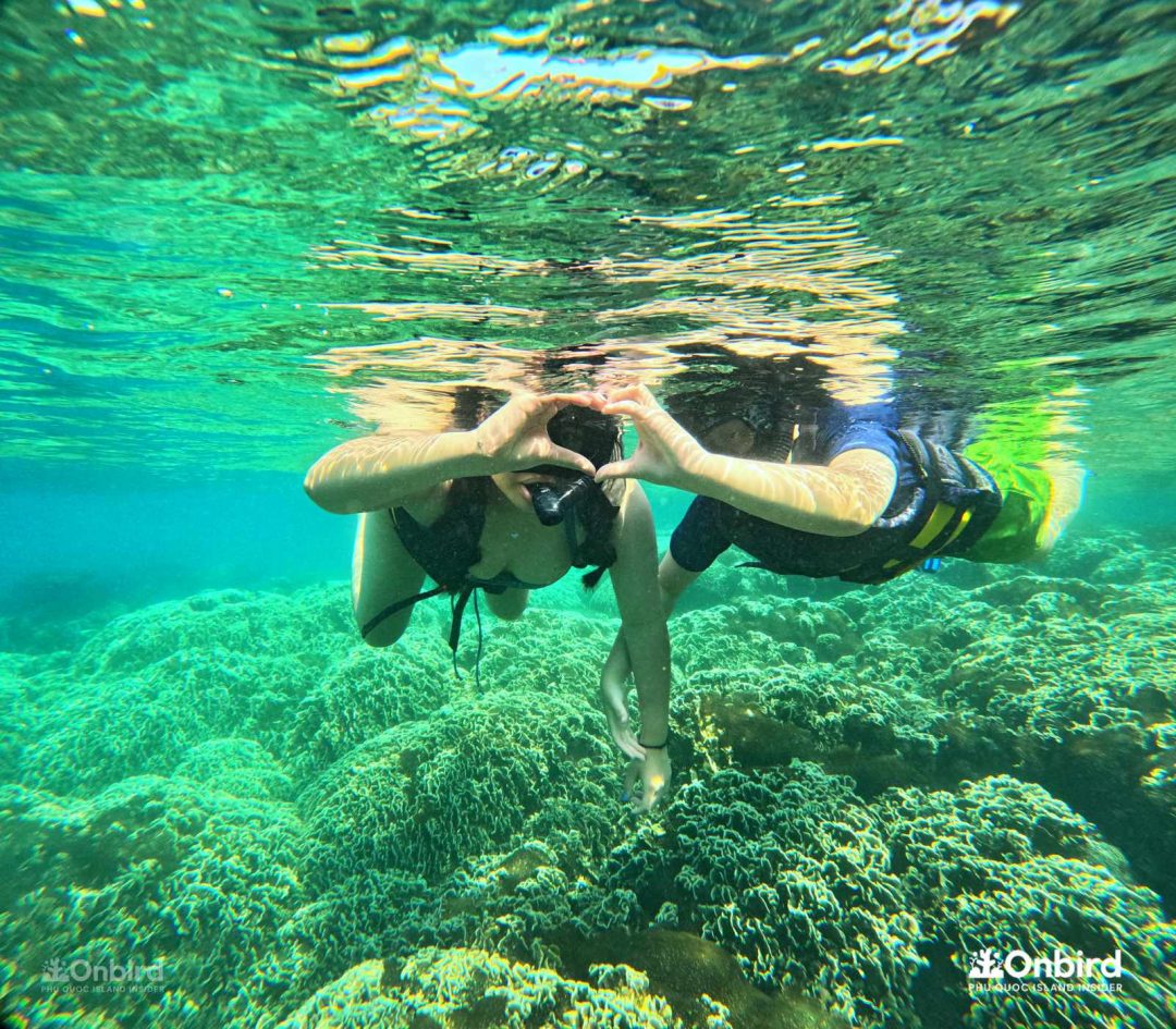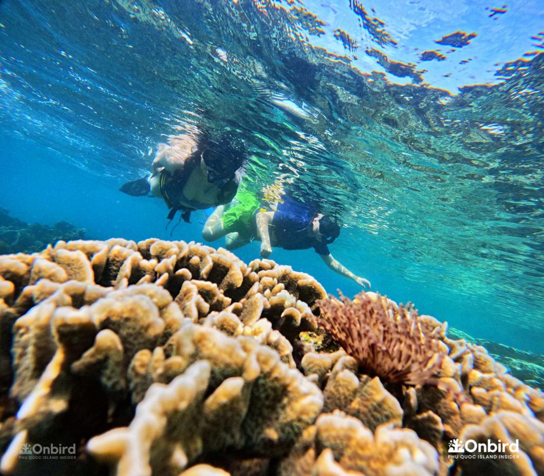 이런 별천지를 구명조끼를 입은 채로 둥둥 떠서 보는 것도 아름다웠지만, 구명조끼 없이 자유로움을 느끼면서 보는 것과는 비할 바가 안됩니다. 사람들이 왜 수중스포츠를 즐기는지 느낄 수 있었습니다라고 말하는 저는 수영을 아예 못합니다. 중간에 James가 와서 살려줄 테니ㅋㅋㅋㅋ 구명조끼를 벗어보라고 해서 에라 모르겠다 하고 벗어 던졌는데 오리발 때문에 생각보다 잘 뜨더라구요? 수영 못하시는 분들은 꼭 물에서 자유로이 움직이는 느낌을 느껴보라고 말씀드리고 싶네요. 두려움으로부터 벗어나게 도와준 덕분에 푸꾸옥을 더 만끽할 수 있었습니다.
