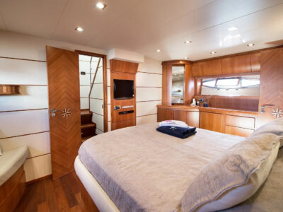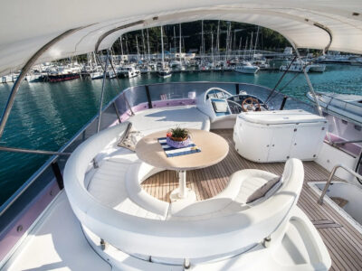 - The flybridge boasts comfortable seating for 6-7, providing a panoramic vantage point to admire the surrounding vistas.
